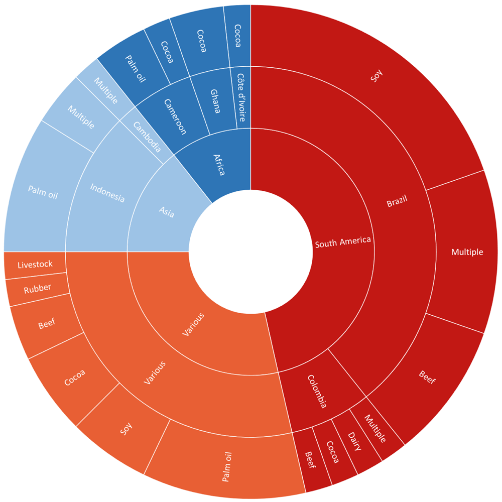 The most common commodity and study area examined exclusively by studies was Brazilian soy, followed by Brazilian beef, and Indonesian palm oil (Figure 2). Cocoa was the most commonly studied commodity in Africa, whereas palm oil was the most frequent in Asia and soy in South America. Commodities covered in studies looking at more than one geographical context included soy, palm oil, and rubber.