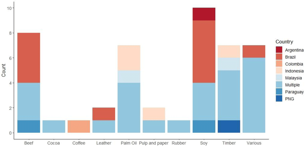 In the studies selected after the second screening, a more detailed assessment of commodities covered was conducted. The most common commodity and study area examined exclusively was also Brazilian soy (Figure 3). Other Latin American countries commonly presented in results included Argentina, Bolivia, Colombia, and Paraguay. Indonesia, Malaysia, and Papua New Guinea were also frequently mentioned. After soy, beef, palm oil, and timber were the most common commodities studied exclusively (Figure 3). Other tropical deforestation risk commodities include pulp and paper, leather, rubber, cocoa and coffee.