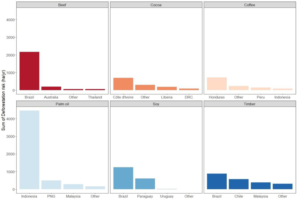 It is important to note that other countries also contribute to each commodity’s deforestation risk but are not shown in Figure 5 as they constitute a relatively small proportion to overall risk. This is demonstrated in Figure 6 where the total from all other countries shows a relatively small contribution to each commodities deforestation risk. Furthermore, it is also important to note this study only covers commodities associated with tropical deforestation, hence there is a risk of bias.